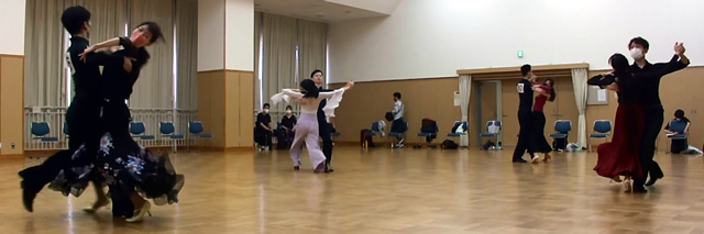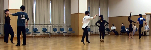 練習10ダンスの特徴は、『みなさんの荷物をいつものサークルへ行く程度に少なくしてより気楽に参加できるように練習着で踊り』、『同一ペアーで5種目まで組めるようにした』、『出場年齢制限のないオープンな』、といった感じのダンスをはじめたみなさんが一番気楽に参加しやすくした、プチサークル競技会です。