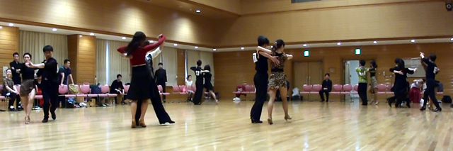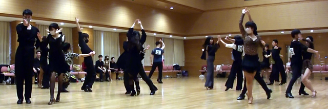 練習10ダンスの特徴は、『みなさんの荷物をいつものサークルへ行く程度に少なくしてより気楽に参加できるように練習着で踊り』、『同一ペアーで5種目まで組めるようにした』、『出場年齢制限のないオープンな』、といった感じのダンスをはじめたみなさんが一番気楽に参加しやすくした、プチサークル競技会です。