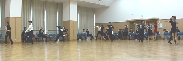 練習10ダンスの特徴は、『みなさんの荷物をいつものサークルへ行く程度に少なくしてより気楽に参加できるように練習着で踊り』、『同一ペアーで5種目まで組めるようにした』、『出場年齢制限のないオープンな』、といった感じのダンスをはじめたみなさんが一番気楽に参加しやすくした、プチサークル競技会です。