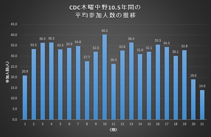 一方、CDC1期~21期10年半の、平均参加人数の推移グラフがこちらです。